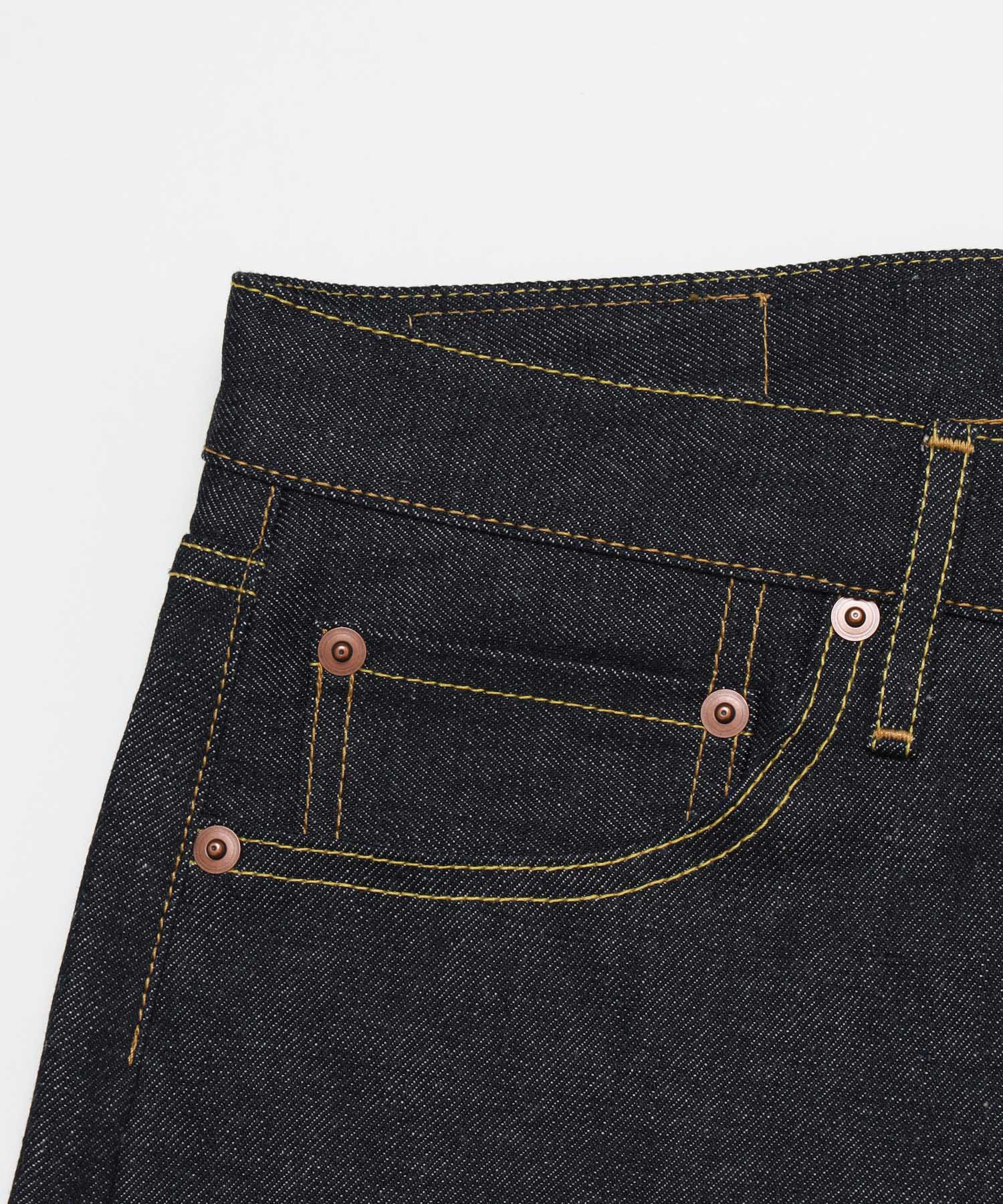 リジッドデニムならではの色落ちや経年変化も楽しみつつ、シンプルなデザインでコーディネートにも取り入れやすいジーンズ。